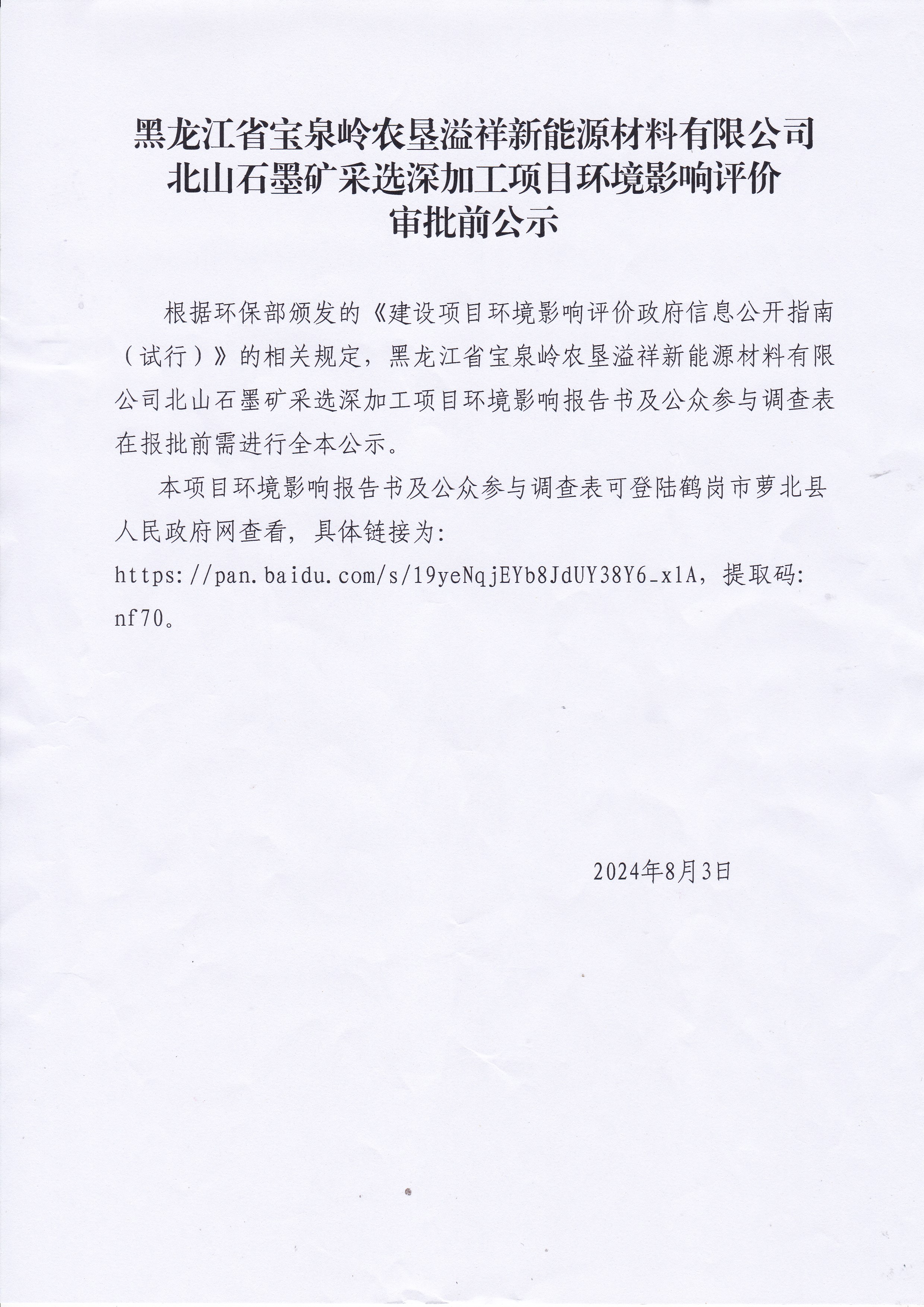 黑龙江省宝泉岭农垦溢祥新能源材料有限公司北山石墨矿采选深加工项目环境影响评价审批前公示