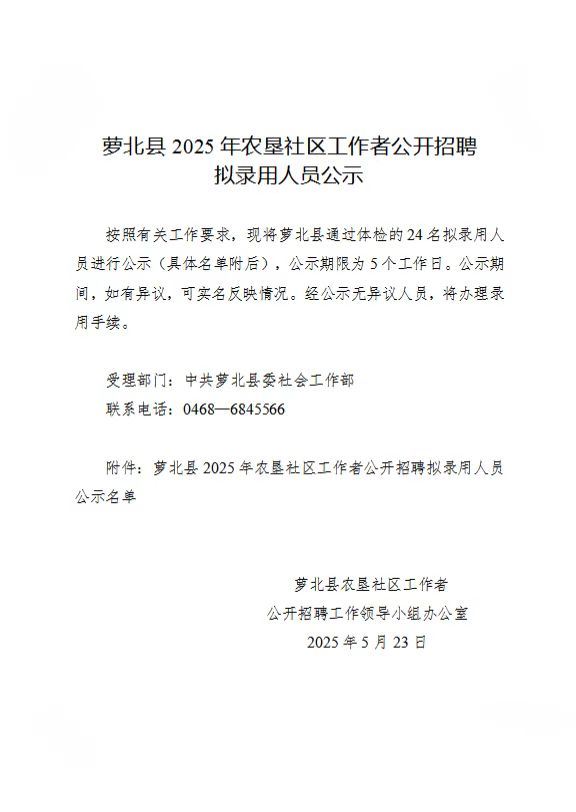 萝北县 2025 年农垦社区工作者公开招聘拟录用人员公示