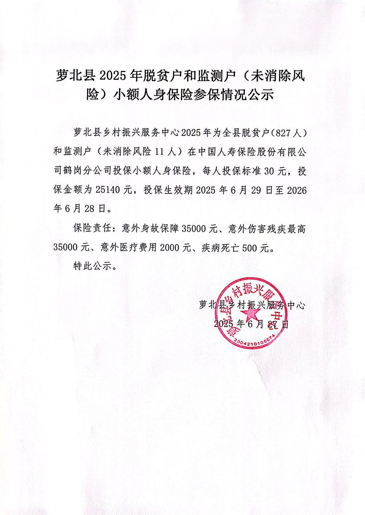 萝北县2025年脱贫户和监测户(未消除风险)小额人身保险参保情况公示