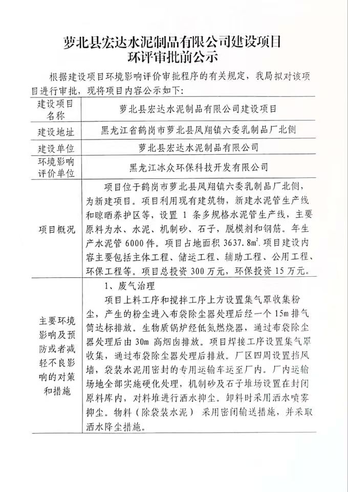 萝北县宏达水泥制品有限公司建设项目环评审批前公示