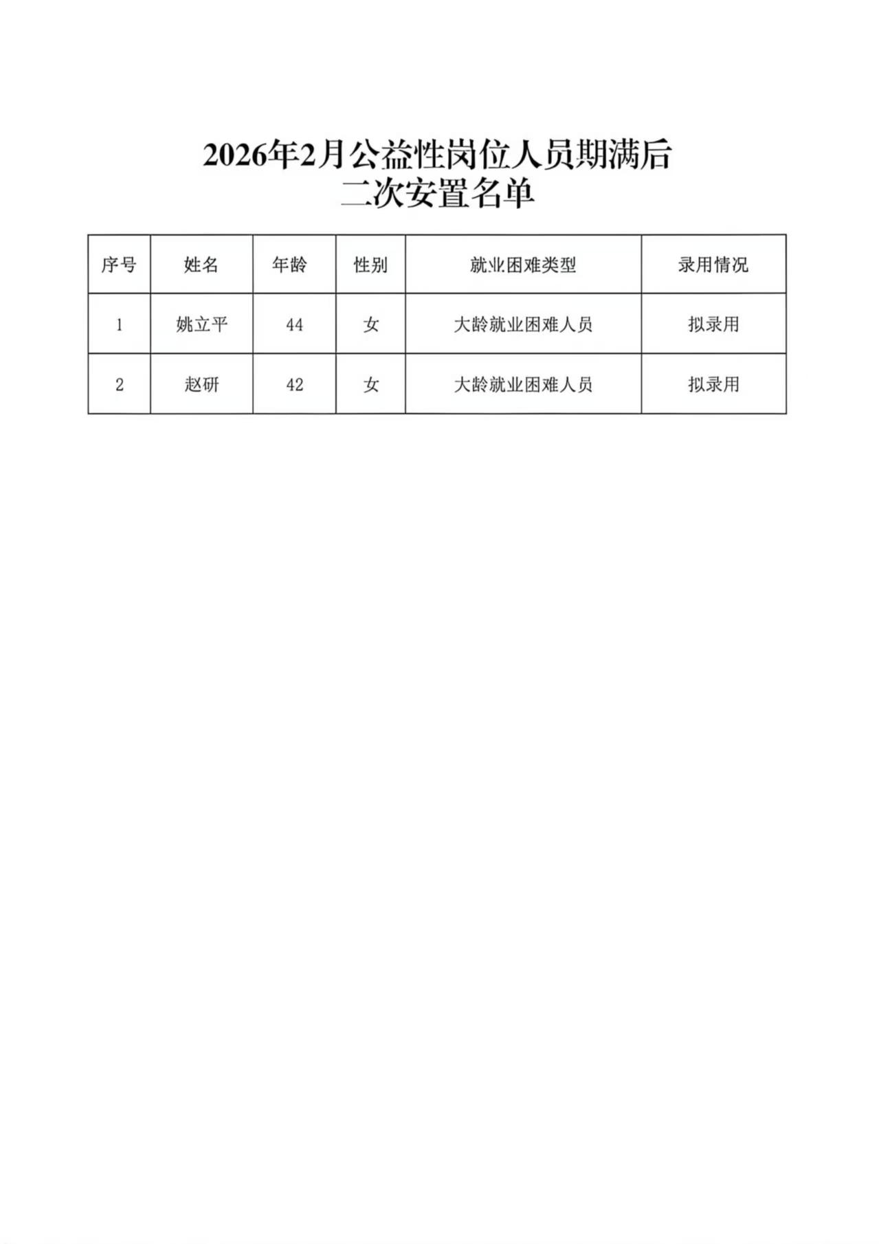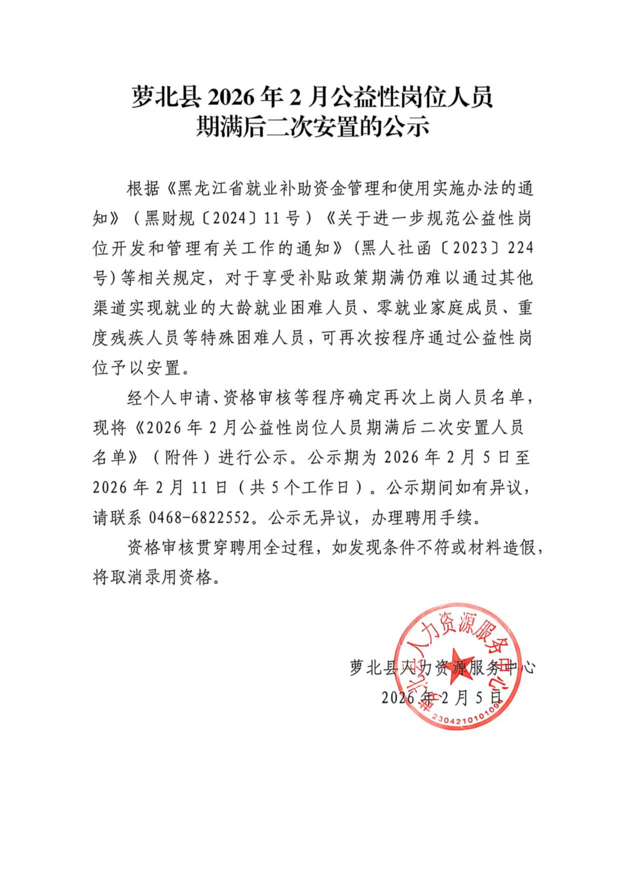 萝北县2026年2月公益性岗位人员期满后二次安置的公示