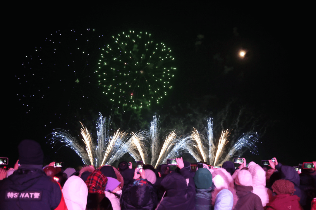 在燃放烟花现场,大家沉浸在绚丽多彩的烟花中,纷纷用手机记录精彩的时刻。