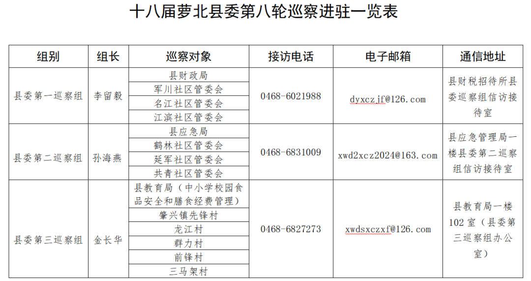 据悉,巡察期间设立接访电话和邮政信箱,主要受理反映被巡察党组织领导班子及其成员、下一级党组织主要负责人和重点岗位人员问题的来信来电来访,重点是关于违反政治纪律、组织纪律、廉洁纪律、群众纪律、工作纪律和生活纪律等方面的举报和反映。巡察组受理信访时间以巡察公告为准。